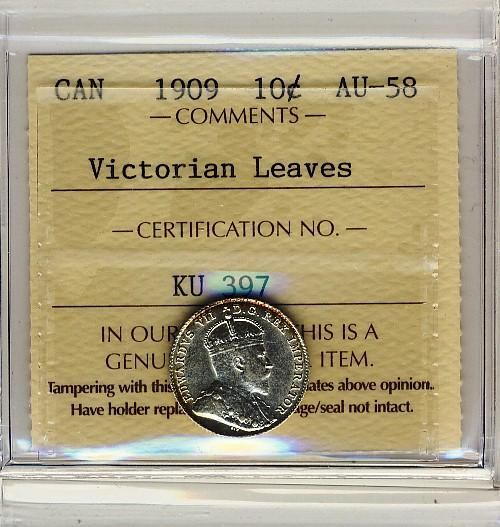 1909 10¢ VL ICCS AU58. Nice lustre with gold rim turn.