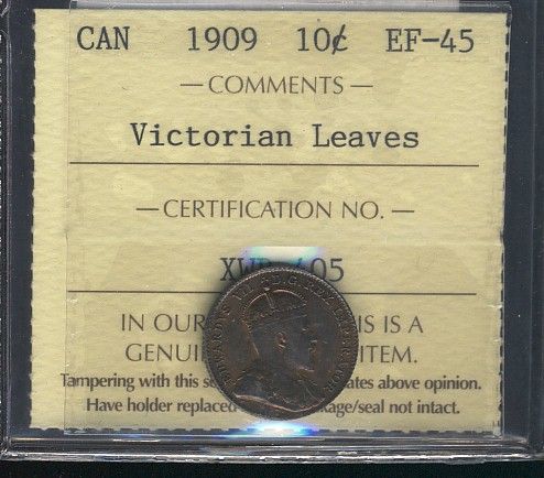 1909 10¢ Vic Lvs ICCS EF45. Lustrous.