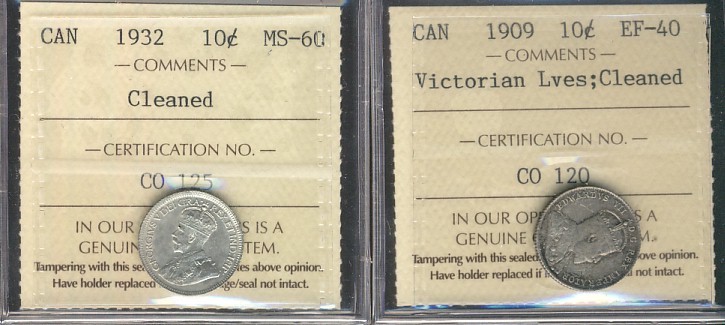 1909 10¢ Victorian Lvs EF40 & 1932 MS60. Lot of 2 ICCS cleaned coins.