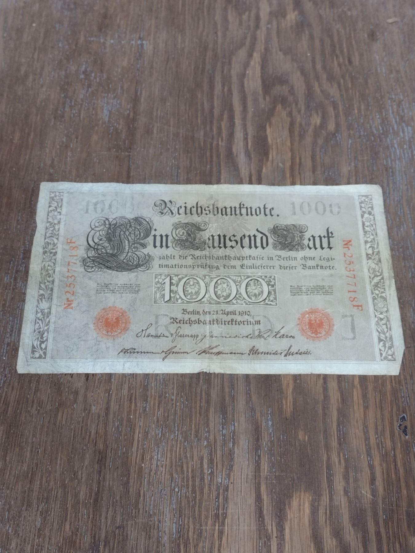 This is a 1,000 Mark banknote issued by the German Reichsbank, dated April 21, 1909. The Reichsbank was the central bank of the German Empire and later the Weimar Republic. This particular note is from the period before World War I, when the German Mark was still a stable currency.