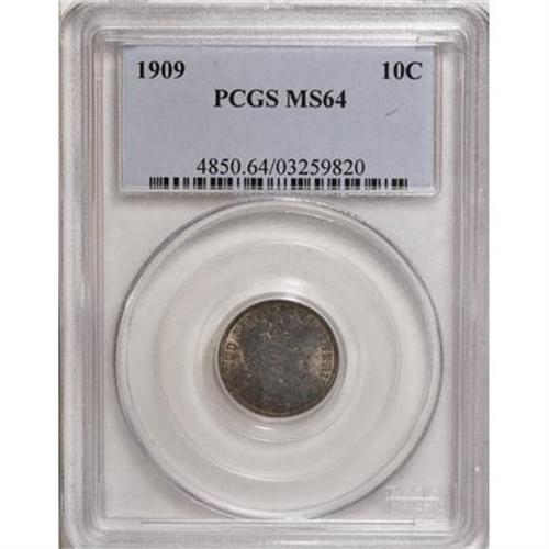 <B>1909 10C MS64 PCGS.</B></I> . PCGS Population (77/44). NGC Census: (70/36). Mintage: 10,240,650. Numismedia Wsl. Price for NGC/PCGS coin in MS64: $252. (#4850)<BR><BR><B>Coin Engraver:</B> Charles E. Barber<BR><BR><b>Shipping:</b> Coins & Currency (<a target="_blank" href="http://www.heritageauctions.com/common/shipping.php">view shipping information</a>)