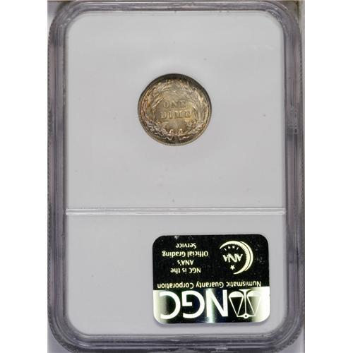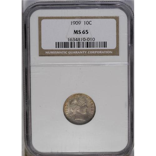 <B>1909<10C> MS65 NGC.</B></I> Dusky mauve-gray and tawny-gold alternate across this shimmering and nearly unabraded Gem. Since the low mintage 1909-S VDB cent was saved in large numbers, the high mintage 1909 dime is today far scarcer in better Mint State grades. Census: 28 in 65, 11 finer (6/06).