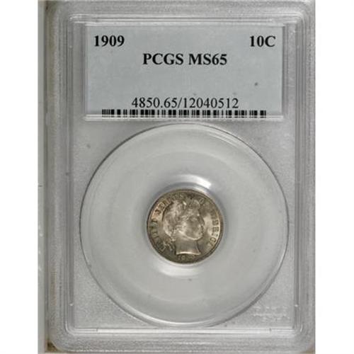 <B>1909 10C MS65 PCGS.</B></I> PCGS Population (32/11). NGC Census: (29/8). Mintage: 10,240,650. Numismedia Wsl. Price for NGC/PCGS coin in MS65: $550. (#4850)<BR><BR><B>Coin Engraver:</B> Charles E. Barber<BR><BR><b>Shipping:</b> Coins & Currency (<a target="_blank" href="http://www.heritageauctions.com/common/shipping.php">view shipping information</a>)