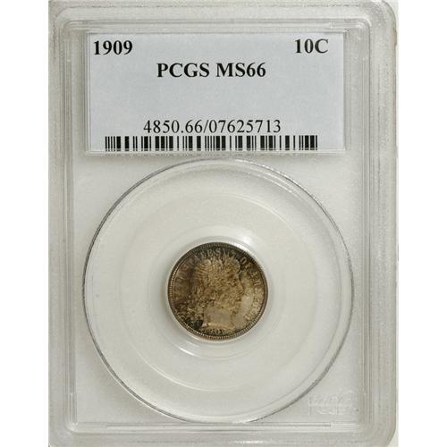 <B>1909 10C MS66 PCGS.</B></I> Captivating multi-colored toning bathes the shining surfaces of this sharply struck Barber dime. Gold, blue-gray, and violet appear in various quantities on this attractive coin. Despite a mintage of over 10 million pieces, few collectors saved examples, and high grade pieces are elusive today. Population: 8 in 66, 3 finer (4/07).<BR><BR><b>Shipping:</b> Coins & Currency (<a target="_blank" href="http://www.heritageauctions.com/common/shipping.php">view shipping information</a>)
