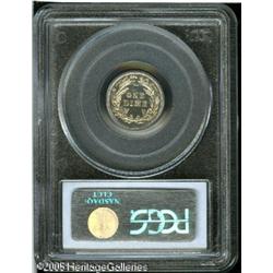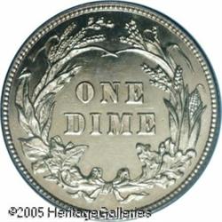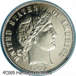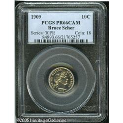 <B>1909 10C PR66 Cameo PCGS.</B></I> A mere 650 proof dimes were coined in 1909, and survivors attaining the level of preservation seen on the specimen in this lot are far and few between. Indeed, this example is tied with only two others for the finest certified by PCGS (1/05). The surfaces are virtually flawless, revealing no marks worthy of mention. Just a whisper of champagne color, interspersed with a splash or two of barely discernible faint violet, rests over each side. The fields are deeply mirrored, and establish a stunning contrast with the motifs. The design features are boldly impressed throughout, resulting in razor-sharp detail even on the intricate elements comprising the reverse wreath. Population: 3 in 66, 0 finer (1/05).<BR><I>From the Bruce Scher #1 All-Time PCGS Registry Set.</B></I> Lot:4069