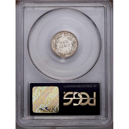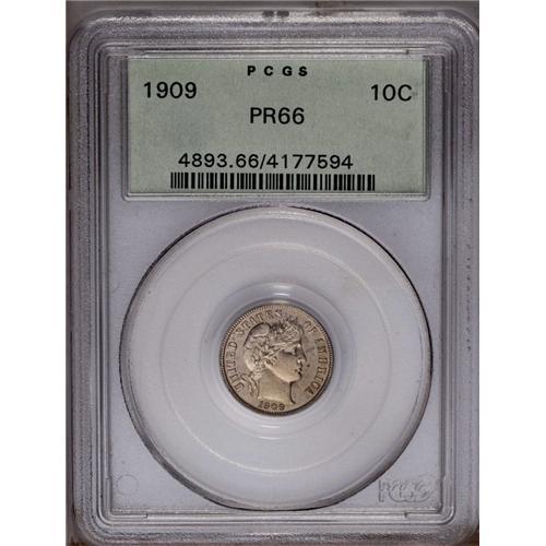 <B>1909<10C> PR66 PCGS.</B></I> An exactingly struck and unblemished specimen. The reverse exhibits obvious white on black contrast. The portrait is also frosty, but light to medium tan-gold toning prevents full obverse contrast. Certified in a green label holder. A scant 650 proofs were struck. Population: 25 in 66, 18 finer (4/06).