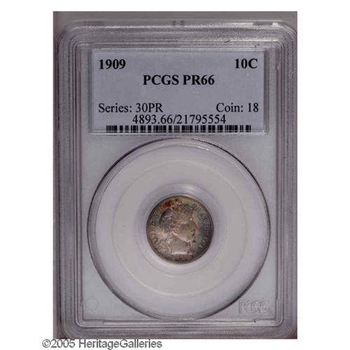 <B>1909<10C> PR66 PCGS.</B></I> The design elements are well executed, and the obverse shows splashes of cobalt-blue, russet, violet, and lavender coloration, while the reverse displays soft hues of gray, light blue, and russet. Neither side depicts any mentionable marks. Population: 25 in 66, 18 finer (11/05).