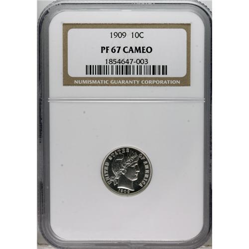 <B>1909 10C PR67 Cameo NGC.</B></I> The devices and legends have thick ice-white frost, and the brilliant surfaces are immaculate aside from a nearly imperceptible fingerprint fragment above the bust tip. Census: 2 in 67 Cameo, 2 finer (2/07).<BR><BR><b>Shipping:</b> Coins & Currency (<a target="_blank" href="http://www.heritageauctions.com/common/shipping.php">view shipping information</a>)