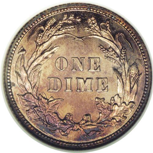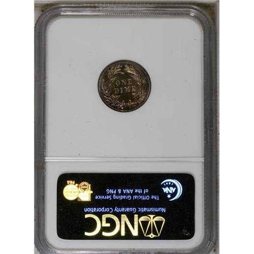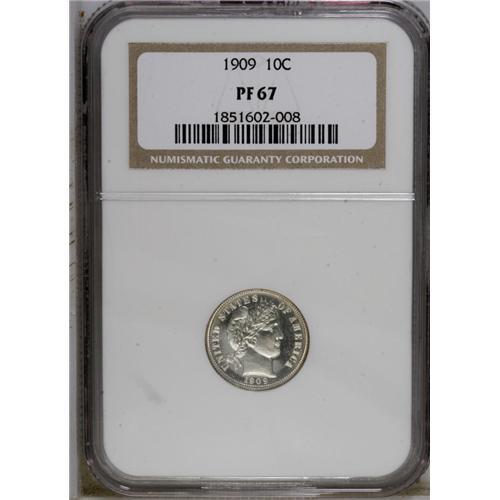 1909 10C PR67 NGC. The obverse is silver-white, while