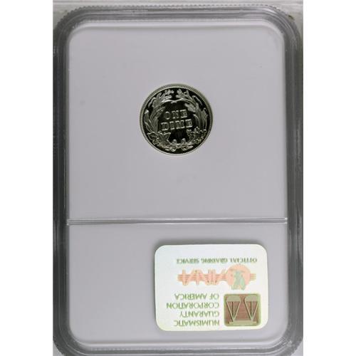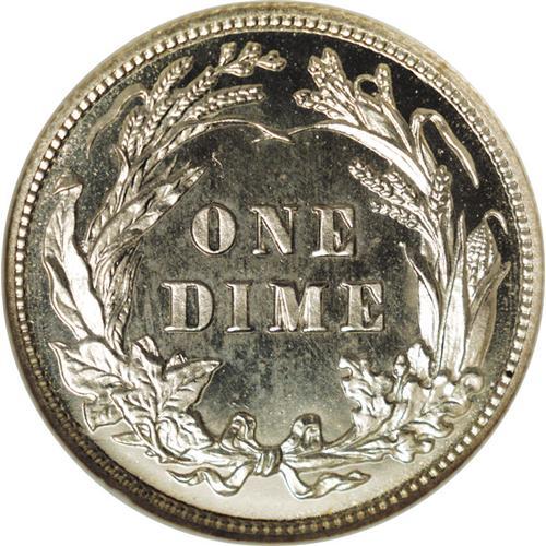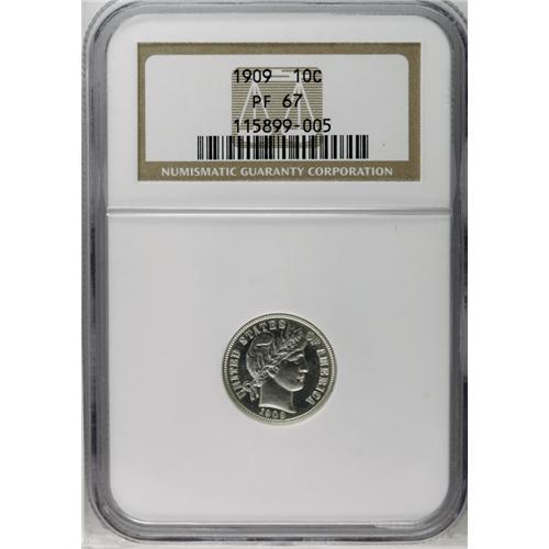 <B>1909<10C> PR67 NGC.</B></I> A scarcer proof issue with only 650 pieces struck. This is a lovely all-white coin that shows a slight, but unacknowledged bit of contrast between the fields and devices on each side. Essentially perfect surfaces, this example is worthy of the finest cabinet. Census: 17 in 67, 2 finer (6/06).<BR><I>From The Belle Glade Collection.</B></I> <BR><BR><B>Importa