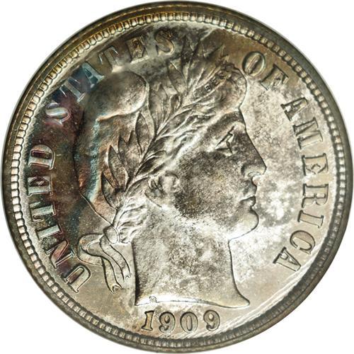<B>1909 10C PR68 NGC.</B></I> An immaculate type coin. The surfaces are free from imperfections to the unaided eye. The deeply mirrored fields flash with undiminished intensity through the overlay of splotchy cobalt-blue and russet iridescence that is seen on each side. This is a sharply struck, uncommonly clean example that is unsurpassed at either service in today's market. Census: 2 in 68, 0 finer (1/06).