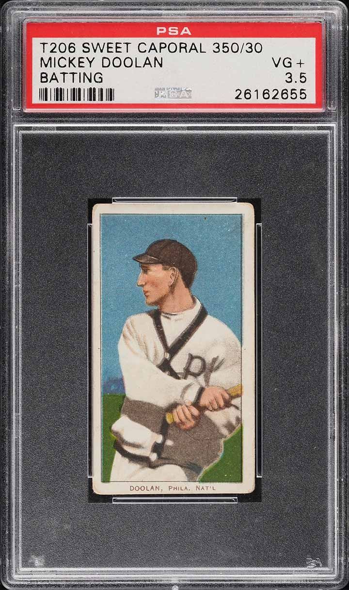 Mickey Doolan (actually spelled "Doolin") was a light hitting infielder who hung around the big leagues for 13 years. This one as a Sweet Caporal backj is graded a solid 3.5 VG+ by PSA.