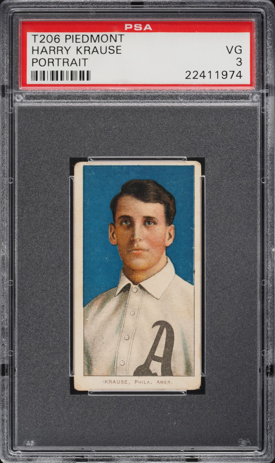 Piedmont tobacco T206 Harry Krause, a pitcher who had a brief career, but nevertheless led the AL in ERA in 1909, while winning two World Series with Connie Mack's powerhouse A's. This one is a nice VG 3, graded by PSA.