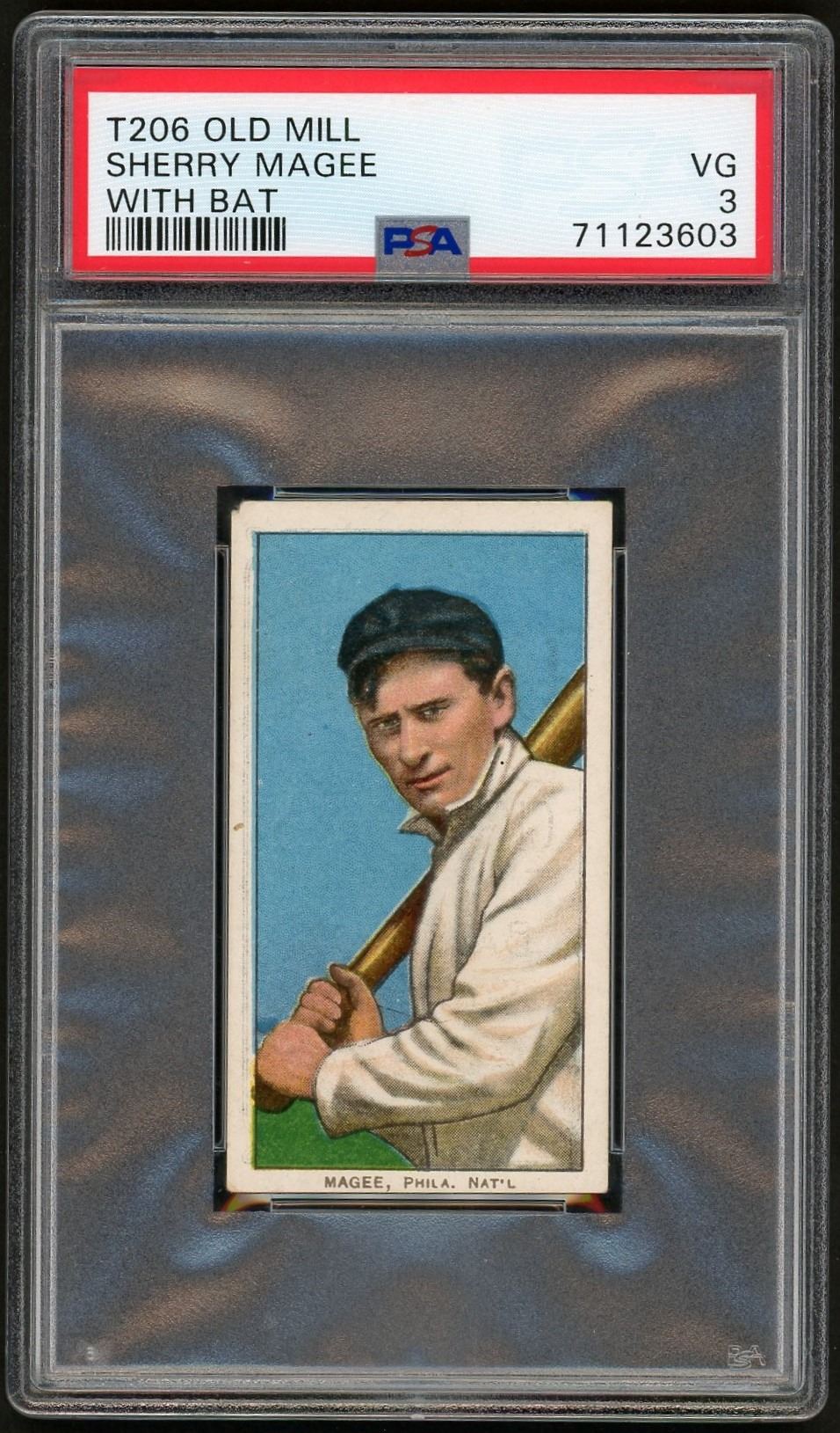 The T206's remain one of the strongest demand issues in the hobby, with prices continuing to move upwards over the past couple of years. This one features Sherry Magee in his "batting" version (there is also a Magee portrait, and a highly prized and ultra expensive error variant) with a much scarcer "Old Mill" back. Magee was one of the premier hitters of the Deadball Era, however his accomplishments are discounted a bit as he spent many years in a very hitter friendly ballpark. He led the National League in batting in 1910, and in RBIs a total of 4 times. This is graded a strong 3 VG by PSA. Of the 587 T206 Magee (batting) cards in the PSA database (vast majority are Piedmont and Sweet Caporal backs), only 30 have the Old Mill back. This is 1 of 8 in this grade (19 graded higher). This is a 110+ year old baseball card of prominent player, and a built in "true" scarcity.
