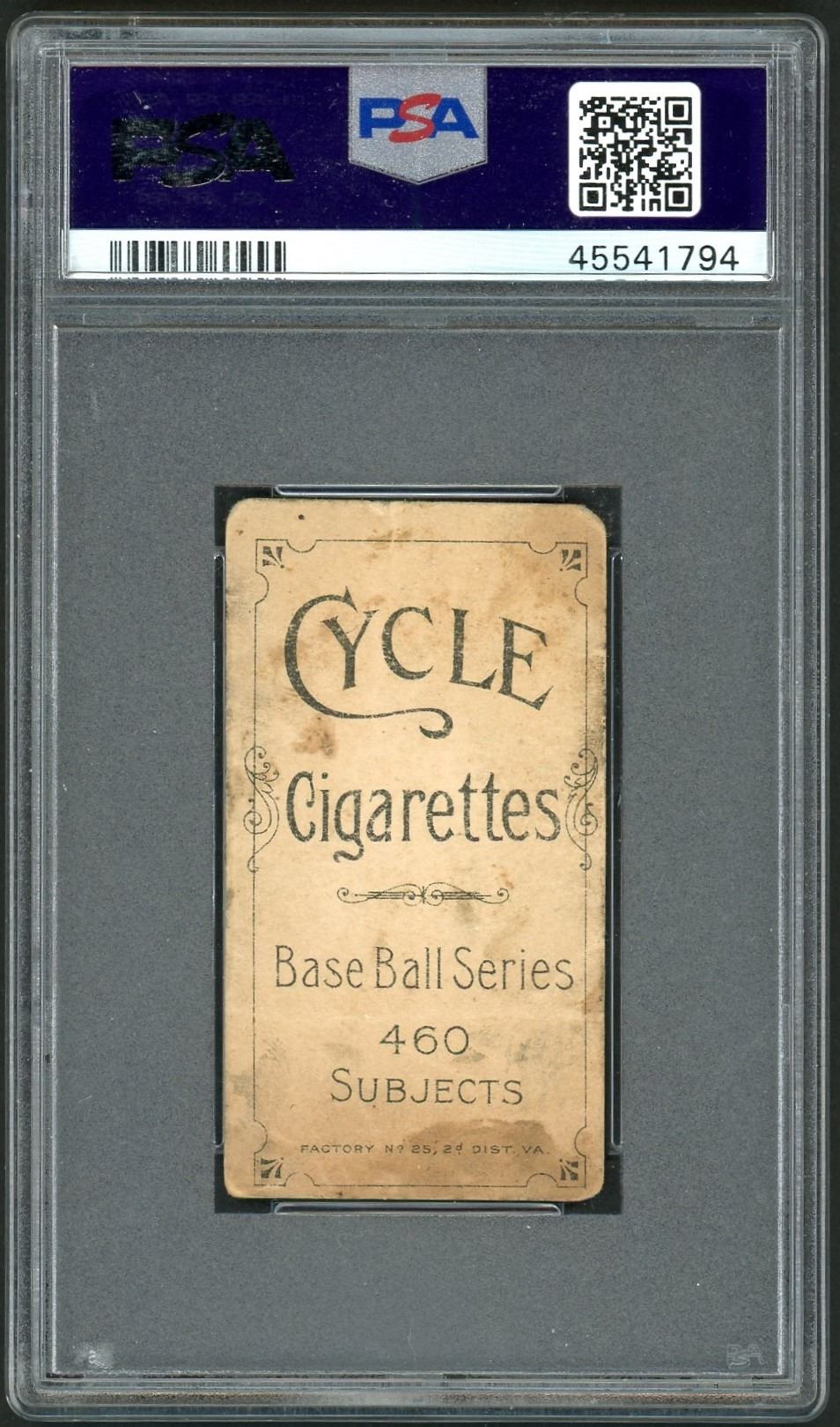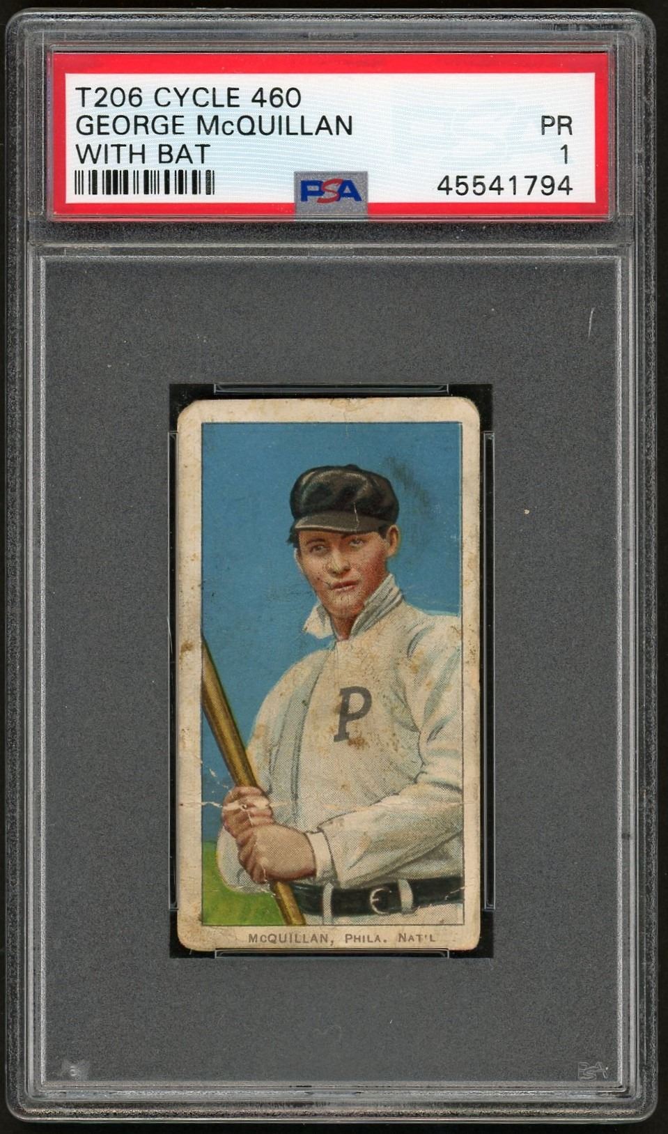 Here's a rare T206 card featuring George McQuillan, who pitched professionally from 1905 to 1926, including a decade in the majors (won 23 games in 1908, posting a 1.53 ERA). This one has the rare Cycle 460 back, with PSA pop showing this as 1 of 2, with 4 higher. Of the 471 total (all backs) McQuillan batting cards in the PSA database, only 6 have been found with the Cycle 460 backs! Rare indeed!