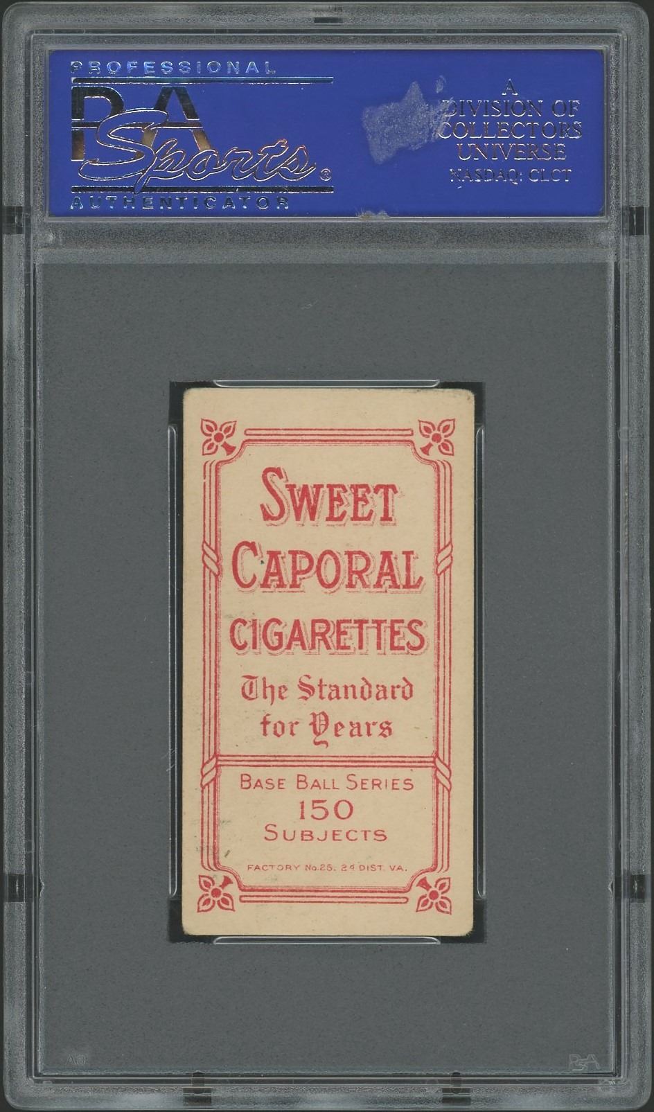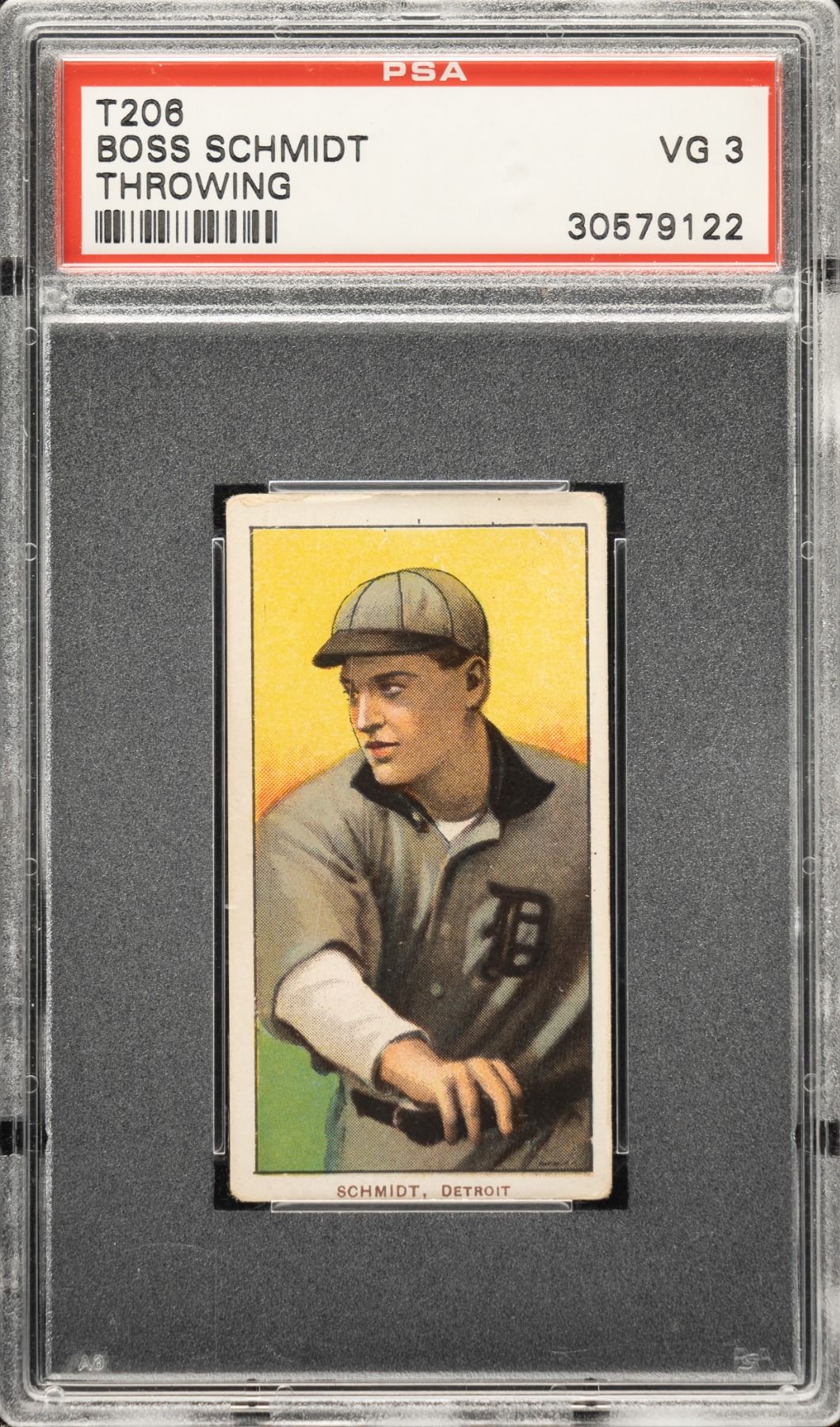 Schmidt was a hard rock catcher who bounced around organized baseball from 1901 to 1926, including 6 seasons with the Detroit Tigers. He is best known for beating up Ty Cobb, his teammate, in an infamous fist fight. This one grades a nice 3 VG by PSA with a Sweet Caporal back.