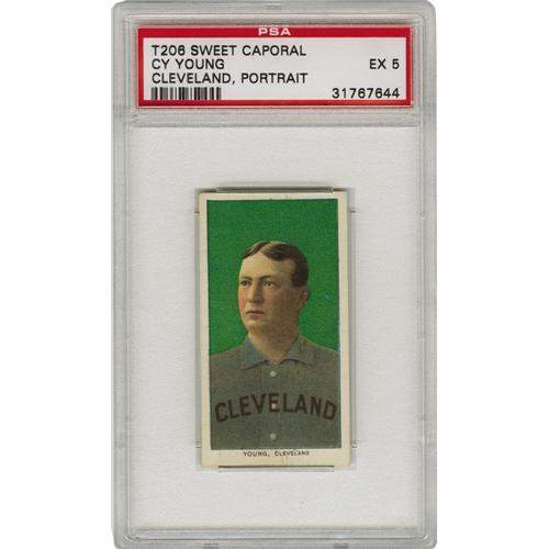 <B>1909-11 T206 Cy Young Portrait PSA EX 5.</B></I> Cy Young's 511 career wins are more than 100 in front of any other pitcher that has ever played the game and represent a benchmark that will likely never be approached. This T206 green portrait rendition is the quintessential Cy Young card for many collectors and this example doesn't disappoint with 50/50 centering on all borders, bold color, and strong registration. The verso is equally clean with a "Sweet Caporal - 150" advertisement.<BR><BR><b>Shipping:</b> Sportscard (<a target="_blank" href="http://www.heritageauctions.com/common/shipping.php">view shipping information</a>)