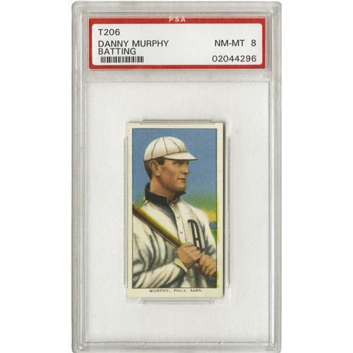 <B>1909-11 T206 Danny Murphy Batting PSA NM-MT 8.</B></I> An expert sign stealer, he was a favorite of Connie Mack and his hometown Philadelphia fans, but he deserted them as his career was ending to join the Federal League. Vibrant colors. Nice even spaced borders. Only one other card grades better. Sweet Caporal back.