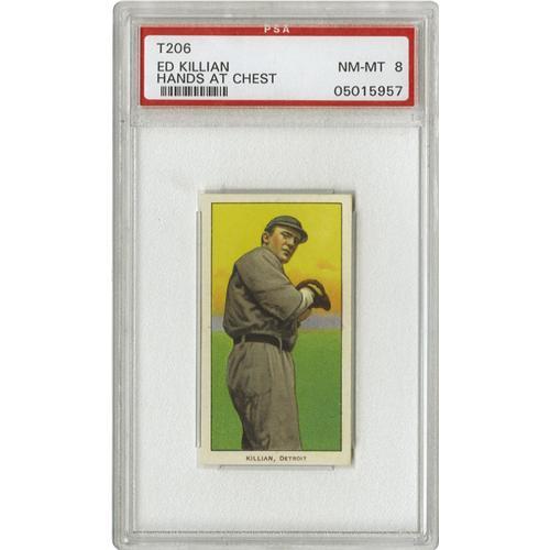 <B>1909-11 T206 Ed Killian Hands at Chest PSA NM-MT 8.</B></I> Killian was the hardest pitcher to homer against in Major League history. Pitching in the dead-ball era, he allowed only nine HR in his career - one every 178 innings - and once went almost four full seasons (1,001 innings) without surrendering one. Evenly spaced bordering with good registration. Only one other grades higher in the PSA population report. Piedmont back.