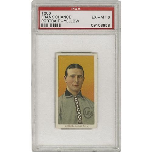 <B>1909-11 T206 Frank Chance Portrait Yellow PSA EX-MT 6.</B></I> The Hall of Fame first baseman for the Chicago Cubs has not aged a minute since his emergence from an ancient pack of smokes. Color and registration are first rate here, with just slight wear at edges. A stunning specimen, as our catalog imagery should indicate. The most valuable of the three Chance variations in this issue.<BR><BR><b>Shipping:</b> Sportscard (<a target="_blank" href="http://www.heritageauctions.com/common/shipping.php">view shipping information</a>)
