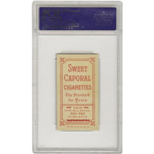 <B>1909-11 T206 George Stovall Batting PSA NM 7.</B></I> Nicknamed "Firebrand" for his hot-headed temper, Stovall was relieved of his St. Louis Browns managerial position in 1913 after an argument with an umpire resulted in Stovall knocking off the ump's hat and dousing his coat with tobacco juice. Here we find him in a quieter moment, bat at the ready. This fine example has only been topped three times on the PSA charts, thanks to its sharp corners, strong registration and quality centering.<BR><BR><b>Shipping:</b> Sportscard (<a target="_blank" href="http://www.heritageauctions.com/common/shipping.php">view shipping information</a>)