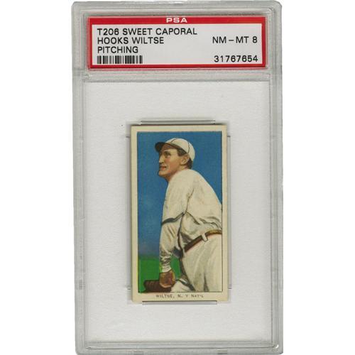 <B>1909-11 T206 Hooks Wiltse Pitching PSA NM-MT 8.</B></I> Independence Day, 1908 saw this New York Giants pitcher bean Philadelphia Phillies pitcher George McQuillan, the twenty-seventh batter in a previously perfect game that he would ultimately win one to nothing in a ten-inning no-hitter. Issued in the ensuing years, this gorgeous tobacco card exhibits hardly a hint of wear, and even perfectly spaced borders to provide its top-notch grade. Only three have tied this offering on the PSA population charts, with none grading higher.<BR><BR><b>Shipping:</b> Sportscard (<a target="_blank" href="http://www.heritageauctions.com/common/shipping.php">view shipping information</a>)