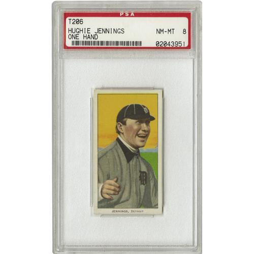 <B>1909-11 T206 Hughie Jennings One Hand PSA NM-MT 8.</B></I> Jennings helmed the Tigers to three straight pennants at his inception from 1907-1909. Great bordering and colors to match. No other card grades higher. Piedmont back.