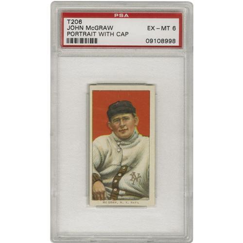 <B>1909-11 T206 John McGraw Portrait With Cap PSA EX-MT 6.</B></I> A moderate westward shift in centering is likely to blame for the grade as listed, as the fine image area and lack of wear offers the appearance of much more expensive card. One smart shopper is going to get a real bargain here. A classic image of the gruff New York Giants skipper.<BR><BR><b>Shipping:</b> Sportscard (<a target="_blank" href="http://www.heritageauctions.com/common/shipping.php">view shipping information</a>)