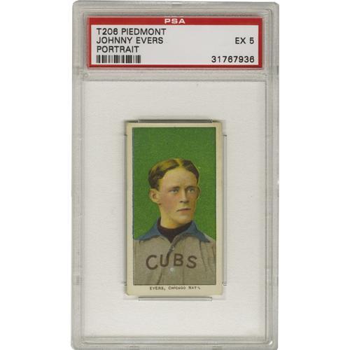 <B>1909-11 T206 Johnny Evers Portrait PSA EX 5.</B></I> The Hall of Fame second baseman of the fabled Chicago Cubs double-play combination appears in bright color and perfect contrast here. Typical corner wear is evident, but centering is first rate, making for a beauty of a card. Piedmont back.<BR><BR><b>Shipping:</b> Sportscard (<a target="_blank" href="http://www.heritageauctions.com/common/shipping.php">view shipping information</a>)