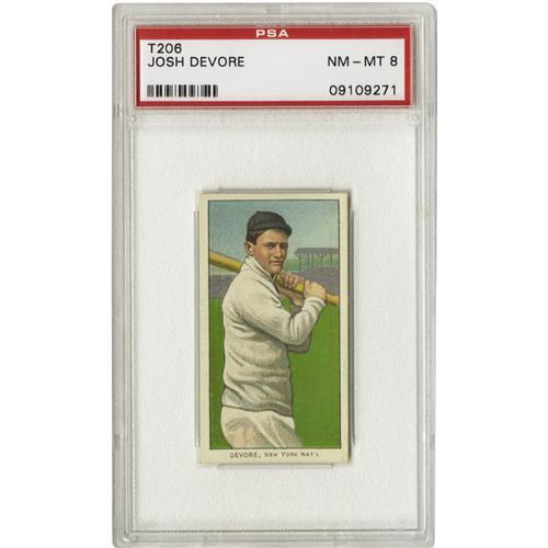 <B>1909-11 T206 Josh Devore PSA NM-MT 8.</B></I> An expert bunter and baserunner who was adept at drawing walks, Devore was an effective leadoff man for the Giants' pennant-winners of 1911 and 1912. Near perfect bordering. Very clean image. Only one other card in this set grades higher. Sweet Caporal back.