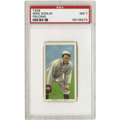 <B>1909-11 T206 Mike Donlin Fielding PSA NM 7.</B></I> Donlin became the idol of Giants fans after coming to New York in 1904. A superb hitter, he topped .300 ten times in twelve Major League seasons. He hit .356 and scored a league-high 124 runs in 1905, then paced the Giants with six hits in their World Series victory over the Athletics. Great coloring. Only three higher graded cards in this set. Sweet Caporal back.