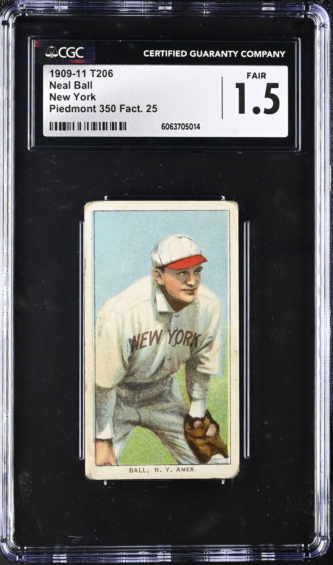 Neal Ball was a Deadball Era infielder who played for several teams over the course of a long pro career. He broke in back in 1903 and played his last game in 1924. Seven of those seasons were spent in the big leagues, and he was a member of the 1912 Boston Red Sox World Series championship team. He is most famous for making the first unassisted triple play in Major League Baseball history on July 19, 1909, while with the Cleveland Naps. From the classic 1909-11 T206 monster set, this is the "New York" version (there is also a "Cleveland" version), graded 1.5 FR by CGC with a Piedmont back.