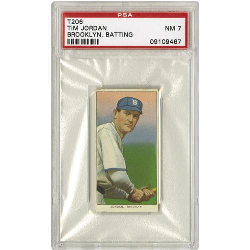 <B>1909-11 T206 Tim Jordan Brooklyn Batting PSA NM 7.</B></I> The popular Jordan was one of the few players to live up to the Brooklyn team's nickname, Superbas. A feared lefthanded slugger, he led the NL with 12 HR in 1906 and 1908. Excellent coloring. Clean clear image. Only four other higher graded cards in this set. American Beauty back.