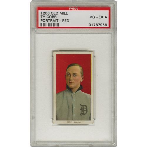 <B>1909-11 T206 Ty Cobb Portrait Red Background PSA VG-EX 4.</B></I> The definitive portrait of the Dead Ball Era's greatest star resides between four perfectly spaced borders on this card from tobacco's most popular issue. Light edge and corner wear is all to note here, as this representation otherwise presents magnificently. Old Mill back.<BR><BR><b>Shipping:</b> Sportscard (<a target="_blank" href="http://www.heritageauctions.com/common/shipping.php">view shipping information</a>)