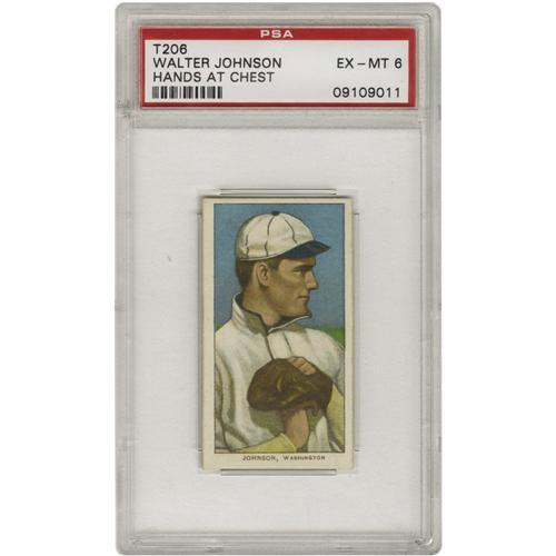 <B>1909-11 T206 Walter Johnson Hands at Chest PSA EX-MT 6.</B></I> Rookie-era issue pictures the young Big Train well over a decade before he would finally achieve World Championship bliss. Just minor edge wear is to be found, but the card is otherwise splendid visually, with bold, bright coloring and clean surfaces.<BR><BR><b>Shipping:</b> Sportscard (<a target="_blank" href="http://www.heritageauctions.com/common/shipping.php">view shipping information</a>)