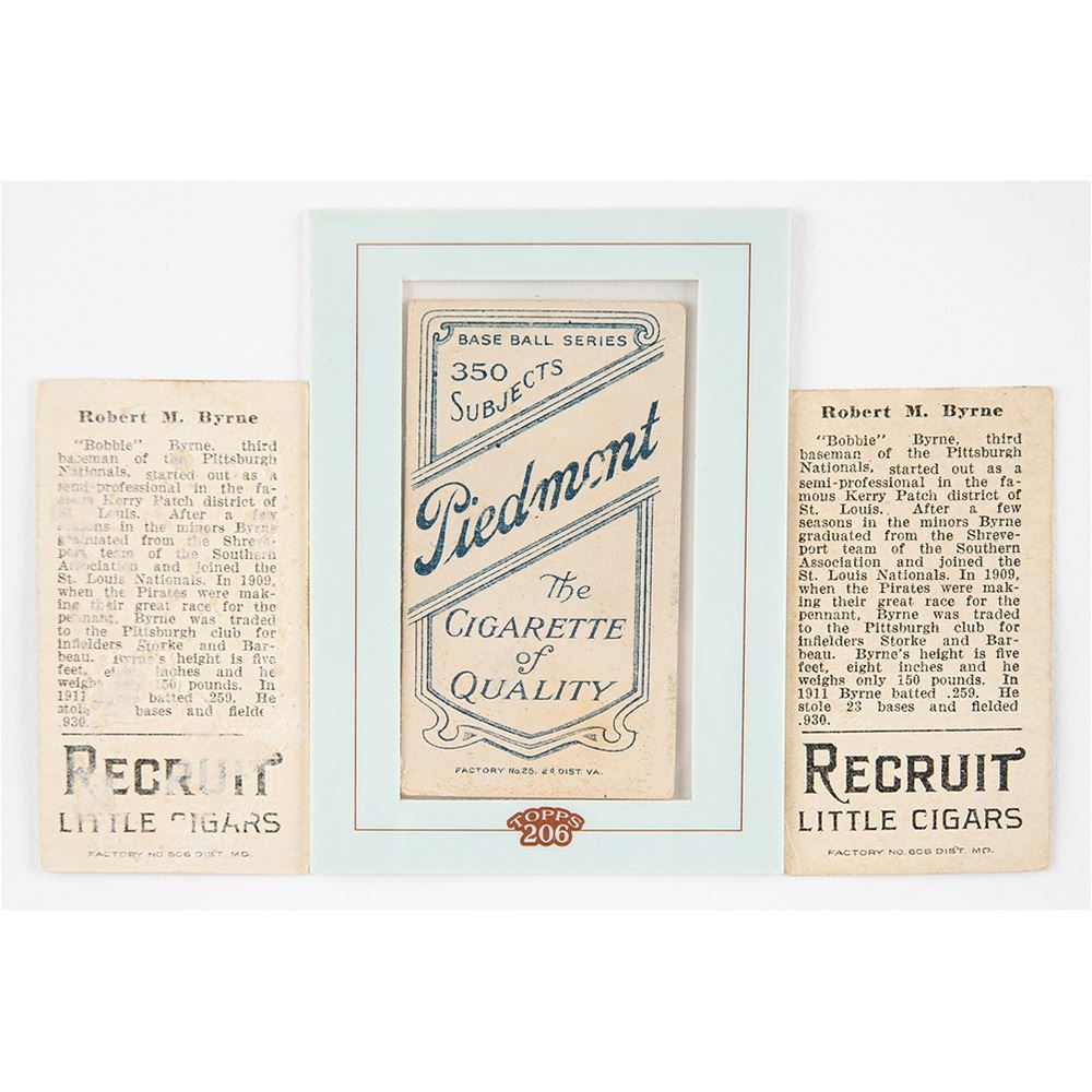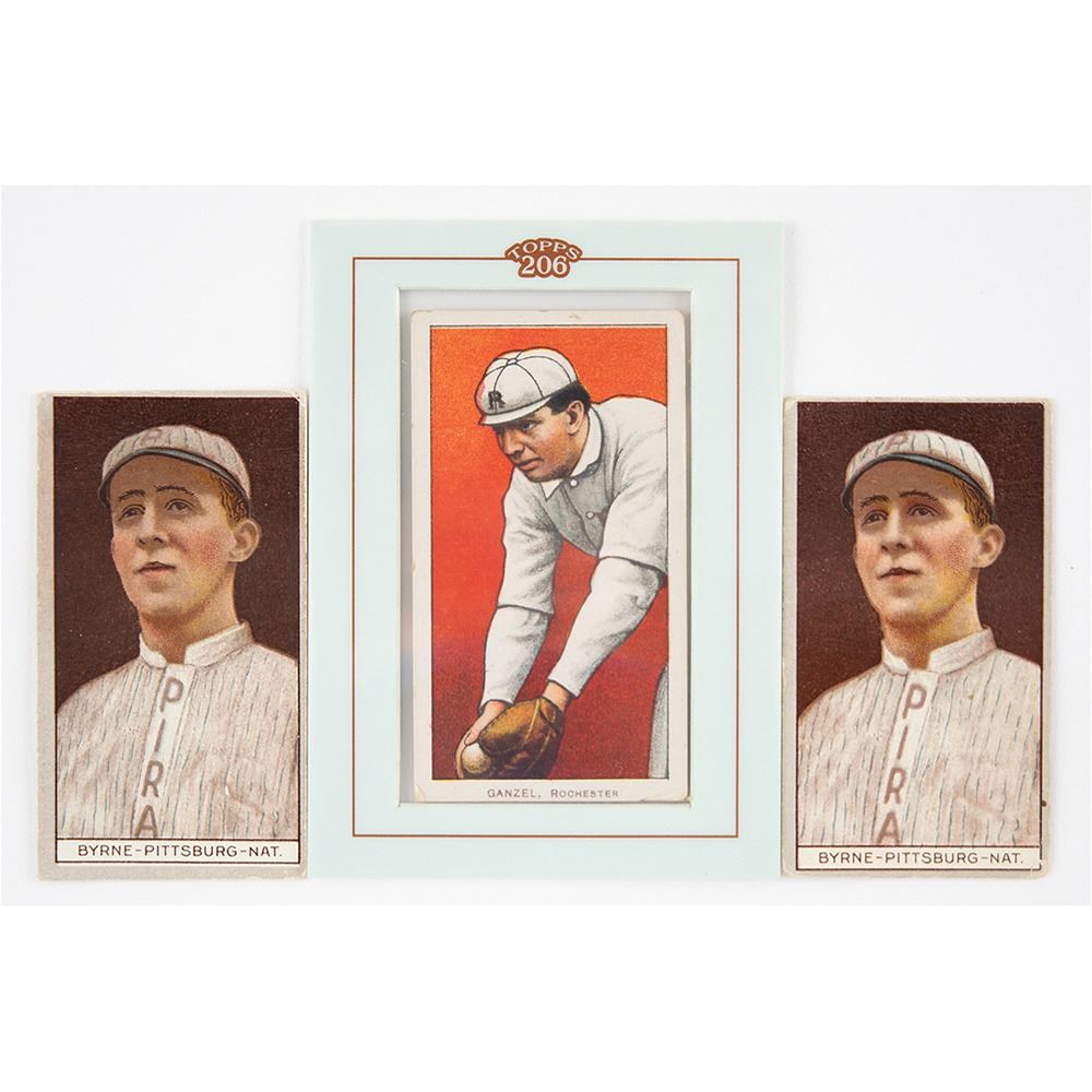 Three 1909-1911 tobacco cards, including: T206 John Ganzel (VG, 2002 Topps 206 buyback), and two T207 Bobby Byrne (G and VG, one with minor scrapbook residue on the reverse).
