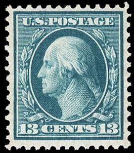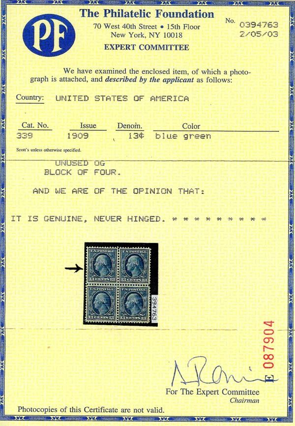 1909, 13¢ Washington, blue green, D.L. watermark. Scott 339. F-VF, with photocopy of 2003 P.F. certificate for block