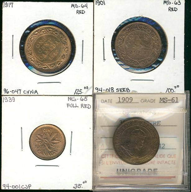 1909, 1901, 1917 & 1939 1¢. Lot of 4 MS coins. Should be viewed.