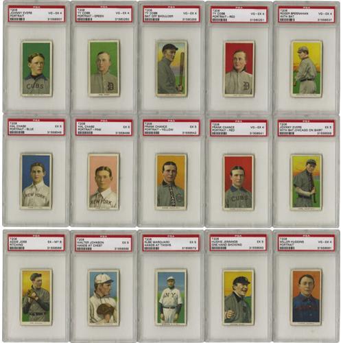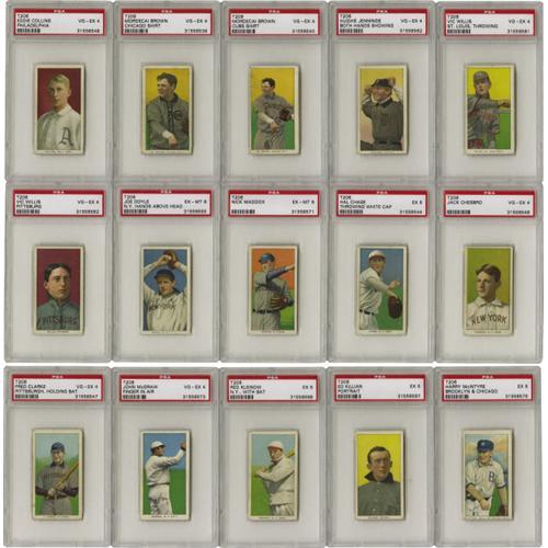 <B>1909-1911 T206 White Border Partial Set (422/521).</B></I> Offered here is a partial set of the American Tobacco Company's classic T206 white border issue. This is an outstanding representation of the most recognized and most widely collected vintage issue in the hobby. A total of 56 cards have been graded by PSA with an aggregate SMR value of $11,380. Includes: Graded Cards - <B>PSA EX-MT 6:</B></I> 4 cards w/ Joss (Pitching), Doyle (NY, Hands above head), Maddox, Dougherty. <B>PSA EX 5:</B></I> 17 Cards w/ Chance (Yellow), Chase (Blue), Chase (Pink), Chase (White Cap), Covaleski, Evers (Chicago), Jennings (One hand), Johnson (Hands at chest), Killian, Kleinow, Marquard (Hands at side). <B>PSA VG-EX 4:</B></I> 20 cards w/ Bresnahan (Bat), Brown (Chicago), Brown (Cubs), Chance (Red), Chesbro, Clarke (Bat), Cobb (Green), Cobb (Bat off), Cobb (Red), Collins, Evers (Portrait), Huggins (Portrait), Jennings (Both Hands), McGraw (Finger in air), Willis (Throwing), Willis (Portrait). <B>PSA VG 3:</B></I> 3 Cards w/ Brown (Port), Griffith (Port), Huggins (Mouth). <B>PSA Good 2:</B></I> 3 Cards w/ Johnson (Port), Mathewson (White Cap), McGraw (Port). <B>PSA PR/FR 1:</B></I> 3 Cards w/ Cobb (Bat on), Mathewson (Dark), Mathewson (Port). Grades 6% EX or better, 55% VG to VG/EX, 32% PR to GD, 7% trimmed or altered. <BR><BR><B>Important notice:</B> Heritage usually auctions material at the rate of 200-250 lots per hour. On some occasions eBay Live bid software or the Internet may not be able to keep up with the pace of the auction. We recommend placing a realistic absentee bid now as insurance to avoid disappointment. Occasionally the auctioneer may eliminate or reject an eBay Live bid, and the auctioneer may also reopen a lot after the close of the eBay live bidding (usually because we missed an audience bid), and may reject your bid even if it shows you as the winning bidder. By bidding via eBay Live, you agree that Heritage may award the lot to another bidder at its sole discretion under the circumstances described above or any other reasonable circumstances. Since eBay bids are not shown to us until we open the lot on the floor, we treat those bids just like floor bids. In most cases the floor responds before the eBay bid is presented to us, due to Internet lag time, so for consistency we have made it a policy that floor bids are always considered first over tie eBay live bids. Also please note that all Heritage lots purchased through eBay Live carry a 22.5% Buyer's Premium. Please make sure you read the Terms and Conditions before you bid. This lot is being auctioned in conjunction with a live floor auction by Heritage Galleries & Auctioneers. All final auction and invoice information will be supplied by Heritage Galleries & Auctioneers, and all other information should be considered preliminary. Lot:19542 <BR><BR><B>Winning Notification and Billing:</B> After the FINAL session in this auction is complete, Heritage will send e-mail and snail mail invoices. This process normally takes several days. All final auction and invoice information will be supplied by Heritage Galleries & Auctioneers, and all other information should be considered preliminary. <BR><BR>This auction will be conducted on a live auction floor and over the Internet through eBay Live. If you choose to place an absentee bid, please take a moment to <font color='#0000ff'><u><a href='http://pages.ebay.com/liveauctions/help/before/laabsentee.html'>learn how eBay Live absentee bidding works</a></u></font><font color='#000000'>