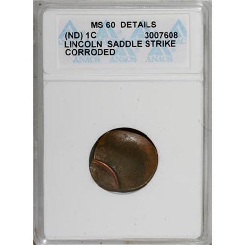 <B>No Date 1C Lincoln Cent--Corroded, Saddle Strike--ANACS. MS60 Details.</B></I><BR><BR><B>Coin Engraver:</B> Victor D. Brenner<BR><BR><b>Shipping:</b> Coins & Currency (<a target="_blank" href="http://www.heritageauctions.com/common/shipping.php">view shipping information</a>)