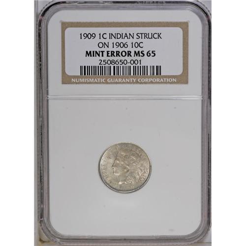 <B>1909<1C> Indian Cent--Struck on 1906 Barber Dime--MS65 NGC.</B></I> We cannot imagine a more spectacular Indian cent error, with the possible exception of the 1862 obverse die cap offered in our Denver Platinum Night auction last month. Previously, a 1906 Barber dime was produced, then became lodged in a large tote bin at the Philadelphia Mint. Some time later, this bin was filled with cent planchets, the struck dime was knocked loose, and eventually found its way into the press run for Indian cents some three years later. That is how we presume this error occurred. How else could a 1906 dime find its way to the cent press in 1909?<BR> Nearly all of the design is visible from both coins, including the 1906 date at about 4 o'clock on the obverse. Approximately 45 degrees' rotation exists between the two strikes. On the reverse, ONE CENT and ONE DIME are both clearly visible. The frosty surfaces have bright silver luster with a trace of gold toning. This classic error easily qualifies as one of the most important and exciting error coins we have handled.