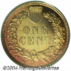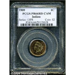 <B>1909<1C> Indian PR66 Red Cameo PCGS.</B></I> Blazing cherry-red color over each side helps to make this a visually stunning Gem. The dynamically reflective fields are dark and provide the backdrop for a lovely cameo contrast with richly frosted devices. There is a ring of deep crimson color about the reverse border. Population: 4 in 66 Cameo, 0 finer (9/04). <BR><BR><B>Important notice:</B> Heritage usually auctions material at the rate of 200-250 lots per hour. On some occasions eBay Live bid software or the Internet may not be able to keep up with the pace of the auction. We recommend placing a realistic absentee bid now as insurance to avoid disappointment. Occasionally the auctioneer may eliminate or reject an eBay Live bid, and the auctioneer may also reopen a lot after the close of the eBay live bidding (usually because we missed an audience bid), and may reject your bid even if it shows you as the winning bidder. By bidding via eBay Live, you agree that Heritage may award the lot to another bidder at its sole discretion under the circumstances described above or any other reasonable circumstances. Since eBay bids are not shown to us until we open the lot on the floor, we treat those bids just like floor bids. In most cases the floor responds before the eBay bid is presented to us, due to Internet lag time, so for consistency we have made it a policy that floor bids are always considered first over tie eBay live bids. Also please note that all Heritage lots purchased through eBay Live carry a 20% Buyer's Premium. Please make sure you read the Terms and Conditions before you bid.