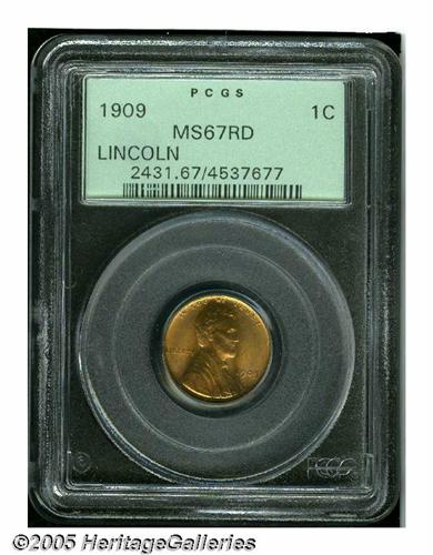 <B>1909<1C> MS67 Red PCGS.</B></I> A razor-sharp and highly lustrous Superb Gem that has lovely rose-gold color. The fields are well preserved, while Lincoln's coat and the N in ONE have only unobtrusive contact. The V.D.B. initials were removed from the dies for later strikes of the date, and they would not return to the design until after the death of Chief Engraver Charles Barber. Housed in an old green label holder. Population: 52 in 67, 0 finer (6/05).<BR><I>From The William Bickel Collection, Part One.</B></I>