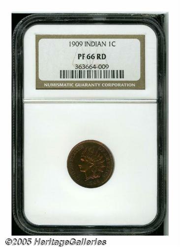 <B>1909<1C> PR 66 Red NGC.</B></I> The otherwise orange-red surfaces yield to gold shading in the peripheries. Suitably mirrored, both sides present expectantly well for the assigned grade. The design elements are exquisitely brought up. A tiny verdigris spot in the upper part of the shield is mentioned for accuracy. Population: 9 in 66, 0 finer (5/05).