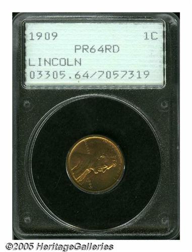 <B>1909<1C> PR64 Red PCGS.</B></I> A lustrous and needle-sharp specimen, light gold in color with an occasional splash of orange-red hues. A few distributed flecks of carbon deny a finer grade. The low mintage matte proofs are the unheralded keys to the Lincoln Cent series. In a first generation holder.