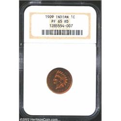 1909 1C PR65 Red NGC. A crisply struck Gem with pleasing intermingled orange and olive shades of color. The surfaces are exceptionally clean. The Philadelphia Mint struck nearly 6,000 proofs in 1909, which were divided between the final Indian Cent issue, the 1909 V.D.B. Lincoln Cent, and the 1909 Lincoln Cent sans initials. Important notice: We expect to be auctioning lots at the rate of 200-250 per hour. Sometimes eBay Premier live bid software cannot keep up with that pace, so we strongly recommend that you place a realistic proxy bid now as insurance to avoid disappointment. Also please note that all Heritage/CAA lots purchased through eBay Premier carry a 20% Buyer's Premium. Please make sure you read the Terms and Conditions.