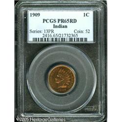 <B>1909 1C PR65 Red PCGS.</B></I> Mostly pumpkin-orange colored with fields that when closely inspected show microscopic die polish lines. Overall, an impressive Gem proof. Lot:5357
