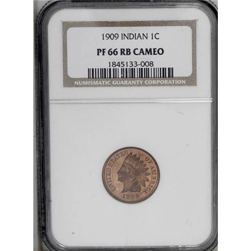 <B>1909<1C> PR66 Red and Brown Cameo NGC.</B></I> Fully struck with sharply reflective fields and deep shadings of red-gold and sea-green over both sides. Carefully preserved and contact-free, with a few scattered flyspecks. A mild cameo effect is noted between fields and devices.
