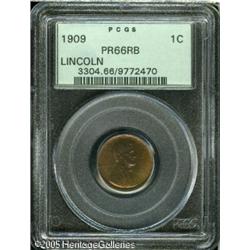 <B>1909 1C PR66 Red and Brown PCGS.</B></I> High end of the eye appeal scale, this proof cent has plum coloration on the obverse portrait and an evenly placed pale violet color on the reverse. The surfaces remain intact without any noticeable distractions. Lot:5607