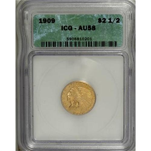 <B>1909 $2 1/2 AU58 ICG.</B></I> NGC Census: (549/3854). PCGS Population (372/2118). Mintage: 441,700. Numismedia Wsl. Price for NGC/PCGS coin in AU58: $231. (#7940)<BR><BR><B>Coin Engraver:</B> Bela Lyon Pratt<BR><BR><b>Shipping:</b> Coins & Currency (<a target="_blank" href="http://www.heritageauctions.com/common/shipping.php">view shipping information</a>\)